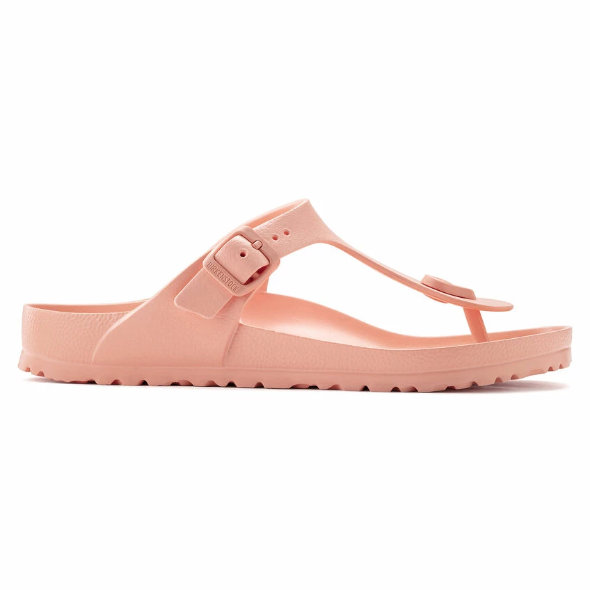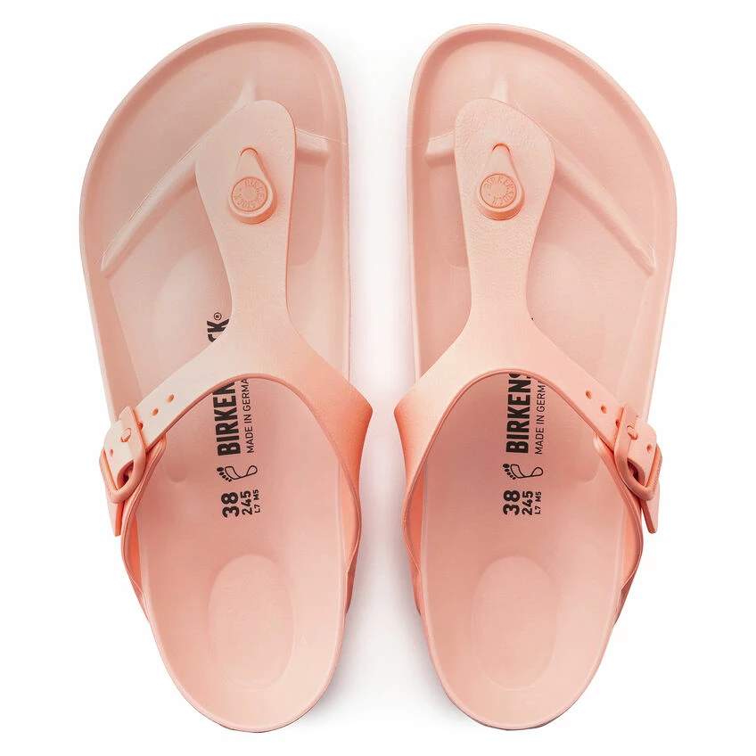 The BIRKENSTOCK Gizeh is our classic thong sandal. Modeled on the cork original, this sandal is made from ultra lightweight and highly flexible EVA. These colorful sandals are shock-absorbent, waterproof, and skin-friendly. Wear them at the beach, in the garden, or in wellness and spa areas. It’s the perfect addition to your classic BIRKENSTOCK sandals.