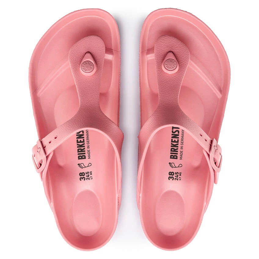 The BIRKENSTOCK Gizeh is our classic thong sandal. Modeled on the cork original, this sandal is made from ultra lightweight and highly flexible EVA. These colorful sandals are shock-absorbent, waterproof, and skin-friendly. Wear them at the beach, in the garden, or in wellness and spa areas. It’s the perfect addition to your classic BIRKENSTOCK sandals.